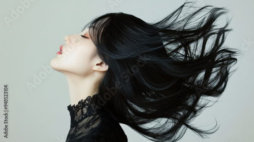 High-fashion photograph of a woman with glossy black hair, head thrown back,