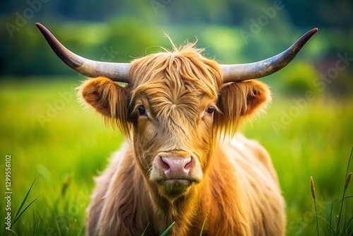 highland cow, cow, cattle, grazing, pasture, field, farm animal, scotland, nature, animal portrait, mammal, farm animal, rural, countryside, agriculture, wildlife, furry, horned, young cow, adorable, farm, landscape, grass, green, sunlight, daytime, animal, herbivore, beef cattle, bovine, wild animal, country life, scenic, beautiful, peaceful, serene, calm, observant, watching, eye contact, closeup, portrait