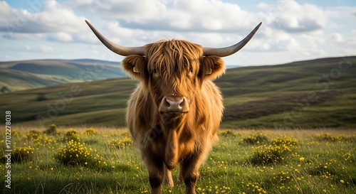 cow, highland, cattle, scottish, animal, mammal, farm, agriculture, rural, landscape, hill, green, grass, pasture, nature, wildlife, countryside, scenic, beautiful, horned, hairy, brown, gold, sunlit, daytime, summer, spring, autumn, field, meadow, horizon, sky, cloud, farmland, farm animal, domestic, ungulate, bovine, herbivore, grazing, peaceful, serene, calm, tranquil, idylli, picturesque, breathtaking, stunning