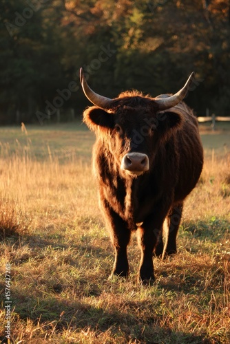 Highland cow standing in golden field, displaying long horns and shaggy coat amid vibrant autumn landscape