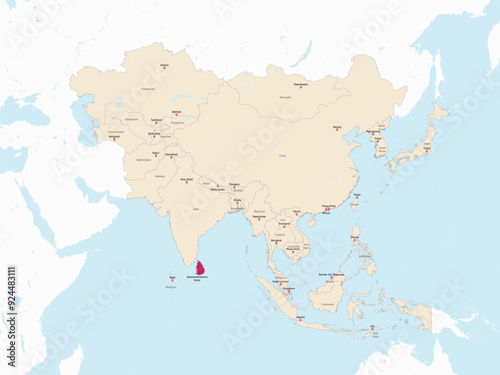 Highlighted map of SRI LANKA inside detailed blank flat political map of the Asian continent on isolated background