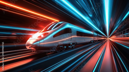 High-speed train in motion at night, neon light trails travel concept