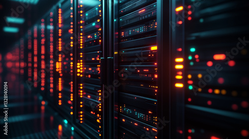 High-Tech Data Center Corridor with Rows of Illuminated Server Racks and LED Indicators, Futuristic interior of modern data centre, Cybersecurity concept