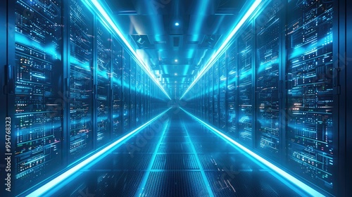 High-tech data center with rows of glowing server racks, symbolizing the concept of big data or global network technology. The blue light illuminates every nook and cranny. Generative AI.