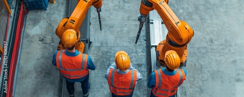 High-Tech Manufacturing Growth. Industrial workers overseeing robotic arms in a warehouse.
