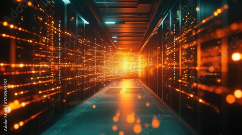 High-Tech Server Room with Glowing Network Equipment – Cybersecurity, IT Infrastructure, and Data Management Concepts in Technology Stock. Business backgroung