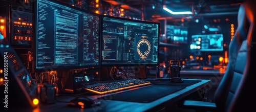technology, monitor, desk, keyboard, coding, screen, light, workspace, gaming, digital, interface, software, datum, electronic, futuristic, design, productivity, innovation, programming, setup, control, network, system, communication, nocturnal, ambience, equipment, cyberspace, research, analysis, automation, visualisation, performance, tool, creativity, engineering, information, cyber, security, virtual, connectivity, intelligence, display, configuration, workstation, environment, efficiency, aesthetic