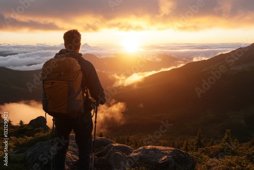 Hiker enjoying a breathtaking sunrise view over mountains and clouds in a serene landscape