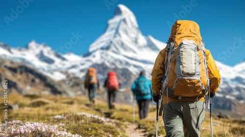 hiker, trail, mountain, snow, backpack, adventure, nature, landscape, outdoors, travel, exploration, trekking, journey, scenery, elevation, flora, sunlight, blue skies, group, physical activity, scenic view, healthy lifestyle, path, wilderness, altitude, summit, peaceful, rugged, majestic, tour tourism, hike, fresh air, exercise, summer, active, excitement, teamwork, beauty, thrill, freedom, serenity, walking, picturesque