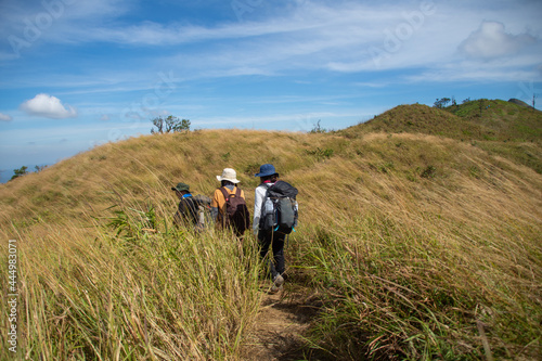 hiking group on mountain at Khao Chang Phueak, Thongphaphoom National Park, Kanchanaburi Province, Thailand. Subject is blurred, noise and color effect.