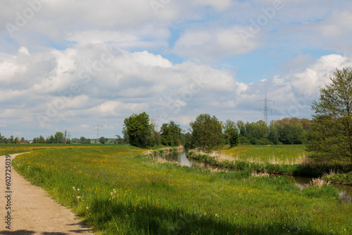 Hilly landscape with green meadows and yellow rape fields in Schmutter valley near Augsburg