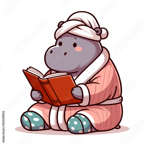 vector, cartoon, hippo, pink, pajama, reading, book, bedtime, night time, relaxation, activity, children, story, character, cute, literature, comfort, cosy, evening, quiet, peaceful, illustration, rest, sleep, leisure, cognition, hippopotamus