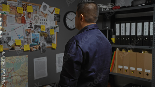 Hispanic man in detective office with evidence board, clock, files, shelving, investigation, documents, and map.