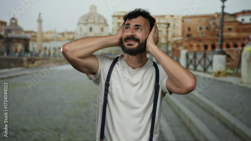 Hispanic man with beard looking distressed in old town rome holding his head in hands wearing suspenders against soft focus background of historical architecture