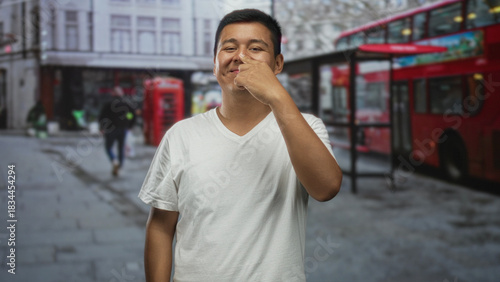 Hispanic young man in white t shirt touching his nose with index finger on a city street beside red double decker bus and telephone box; playfulness.