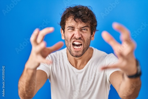Hispanic young man standing over blue background shouting frustrated with rage, hands trying to strangle, yelling mad