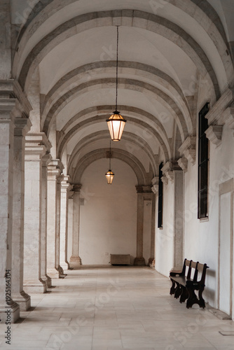 arch, corridor, architecture, arch, hallway, stone, column, historic, symmetry, interior, lantern, perspective, european, classical, travel, monastery, cloister, lisboa, portugal, heritage, old building, empty space, minimalism, cathedral, column, old, europa, history