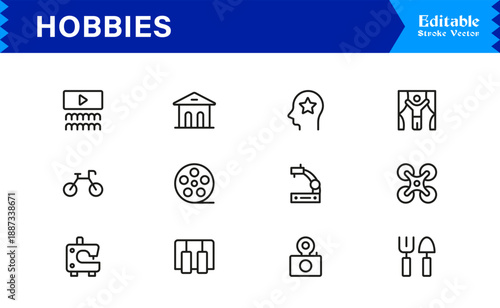 Hobbies Line Icon Collection with Unique Minimal Design, Editable Pixel Perfect Icons Representing Crafts, Sports, Games, Leisure, and Creative Activities