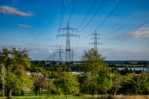 pylon, stream, pylon, electricity, cloudy sky, cloudy, tree, countryside, field, infrastructure, power supply, high voltage, cable, technology, energy, power plant, pylon