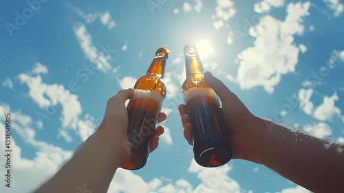 Holding beer bottles toasting each other, against the blue sky, Generative AI illustrations.