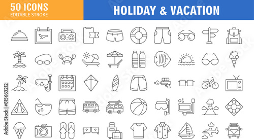 Holiday And Vacation Icon Set. Sunset, Swimming Pool, Surfing, Spa, Hotel, Airplane Ticket, Travel Destinations. Editable Stroke. Vector illustration