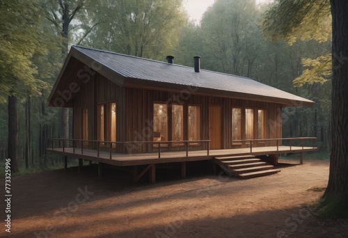 Holiday apartment - wooden cottage in forest in early spring with green grass on back yard and forest in background