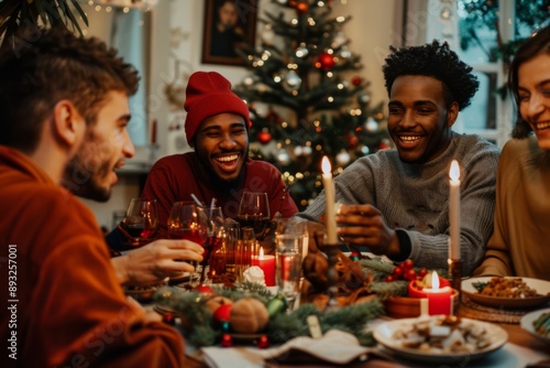 holidays, celebration and people concept. happy multi-ethnic friends having christmas dinner at home.