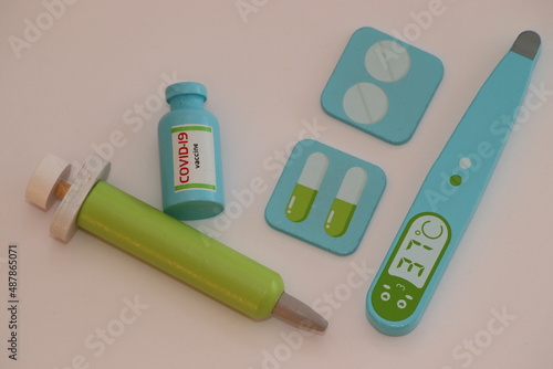 Holzspielzeug, Impfstoff Covid, Spritze, Tabletten, Fieberthermometer