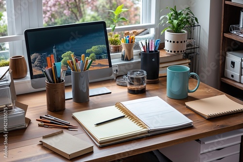Home Office Desk Setup with Stationery Mug Notebook and Blank Space for Ideas