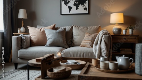 Home sofa with objects of cozy decor in the living room