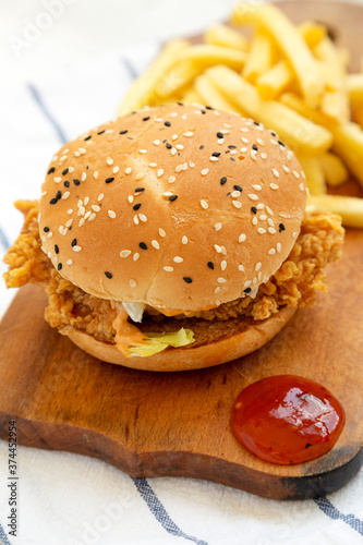 Homemade Chicken Strips Burger with French Fries and sour-sweet sauce on rustic board, side view.