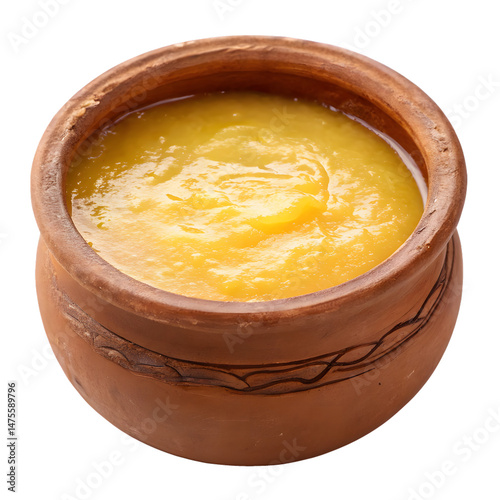 Homemade Desi Ghee in Earthenware Bowl on Transparent Background