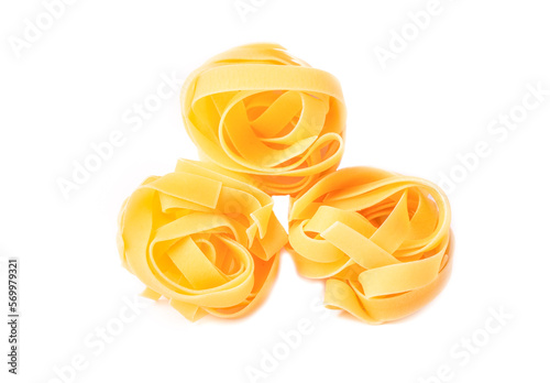 Homemade egg pasta tagliatelle. Raw nest noodles, uncooked ribbon fettuccine, dry long rolled macaroni isolated on white background top view