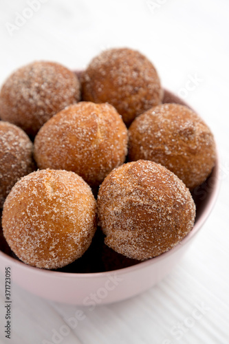 Homemade Fried Donut Holes in a pink bowl on a white wooden background, side view. Close-up.