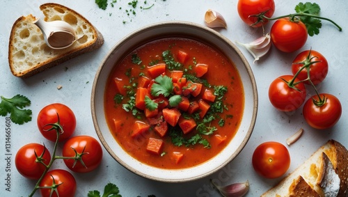 Homemade gazpacho soup served in a bowl against a background. Cold tomato soup. Bird's-eye view, flat lay.