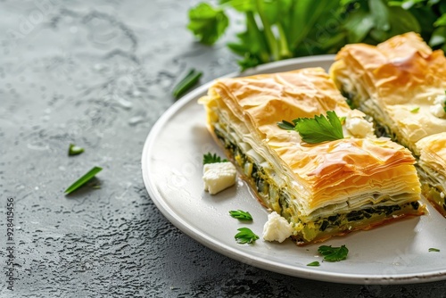 Homemade Greek Spanakopita on white plate vegetarian copy space