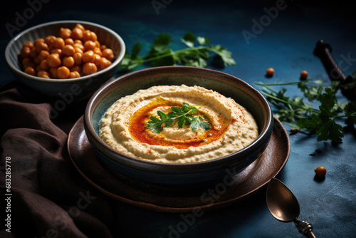 Homemade hummus dip in a rustic ceramic bow.