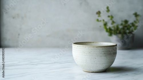 Homemade matcha latte in a ceramic cup on a marble countertop with minimal props