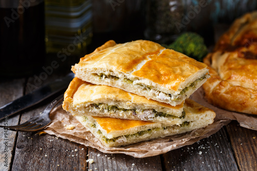 Homemade pie stuffed with chicken ang broccoli