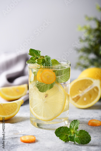 homemade refreshing lemonade in a glass on a light background