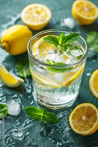 Homemade refreshing summer lemonade with lemon slices, mint leaves and ice in a glass.