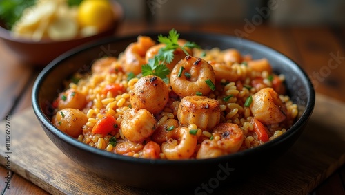 homemade seafood jambalaya new orleans one pot meal served in a bowl on table concept of food industry restaurant catering business