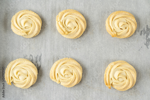 Homemade simple white chocolate cookies in baking tray