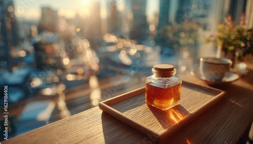 jar, honey, tray, wooden, city, sunrise, window, morning, hot drink, tea, glasses, light, warm, gold, sun, blur, background, sharpened, detail, view, cosy, calm, breakfast, relaxing, natural, simple, elegant, japan, asian, window sill, comfort, still, life, morning light, sunbeam, brown, gold, amber, sweet, delicious, transparent, object, peaceful, beautiful, exterior