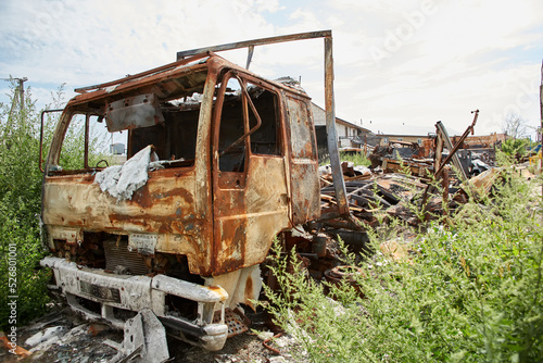 Horenka, Ukraine - August 25, 2022: the consequences of russian invasion in Kyiv region near Gostomel. Civil buildings were bombed and heavily damaged