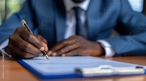 Horizontal close-up photo of an African businessman sitting at a desk, holding a pen, and signing a contract paper. Lease, mortgage, employment HR, or affirm partnership agreement concept.