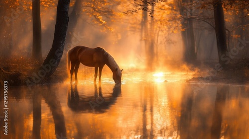 horse, drinking, serene, duck pond, sunrise, nature, peaceful, calmness, mist, autumn, spirit, water, gold, sunlight, morning, animal, beauty, majestic, calm, scenic, wilderness, tree, environment, landscape, wood, atmosphere, warmth, glow, quiet, stillness, harmony, solitude, wild, relaxation, magical, enchanting, dawn, setting, moment