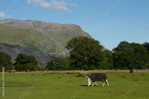 equine, horse, grazing, jacket, agriculture, blue, coat, cover, field, grass, husbandry, farm animal, mountain, sky, tree, white