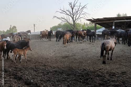horses of different colors and suits walks in a paddock in sunny summer evening. Farm stable. Copy space and Selective focus.