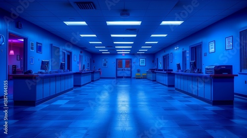 Hospital Corridor Illuminated by Cool Blue Lights with Workstations and Equipment